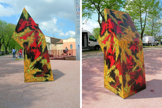 “Bussol8″, a permanent installation in front of Centro Espositivo Museale SMS-San Michele degli Scalzi in Pisa, is a collaboration with architect Roberto Pasqualetti. He designed the shape and i painted it. I just tried to bring back the theme from my series of paintings ” Space Oddities”…i like my “outdoor” work to be influenced from my canvases and the other way around.